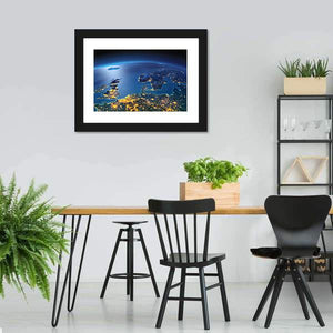 This canvas artwork presents an aerial view of Central Europe, showcasing the map of the region illuminated by night lights. The vibrant palette of blue and yellow highlights the beauty of cities and coastlines, evoking a sense of vastness and global connection.
