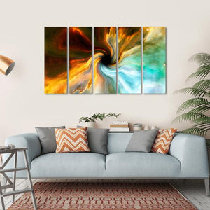 This captivating piece features a black hole at its center, surrounded by swirling galaxies and vibrant nebulae. The dynamic motion and stunning palette of black, orange, teal, and white create an awe-inspiring, cosmic atmosphere that draws the viewer in.
