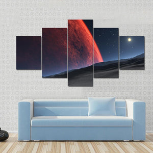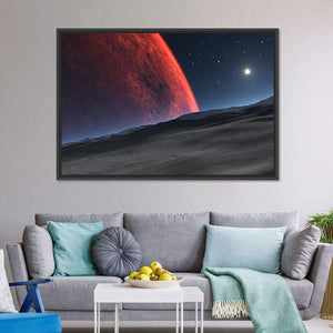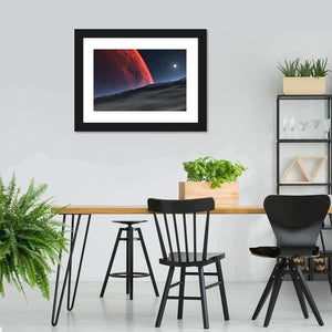 This captivating canvas features a wide-angle view of Deimos against a backdrop of a fiery red planet. Its dark, rocky landscape and twinkling stars create an awe-inspiring, mysterious atmosphere perfect for any modern space.