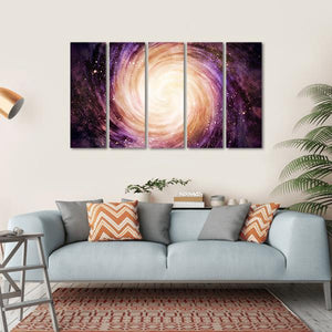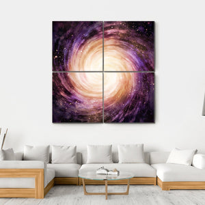 This abstract canvas features a mesmerizing swirling galaxy accompanied by a cosmic nebula and shimmering stars. The vibrant palette of purple, orange, and yellow creates an ethereal atmosphere, perfect for adding a touch of celestial wonder to your décor.