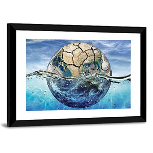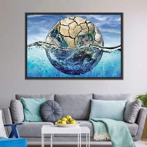 This captivating artwork features a striking contrast between cracked earth and reflective waters, evoking a powerful sense of environmental concern. The blend of blue, brown, and green tones draws attention and sparks thought, making it a meaningful addition to any space.