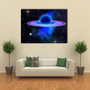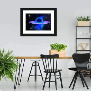This captivating canvas art features a cosmic scene of a glowing black hole, surrounded by vibrant nebulae, planets, and shimmering stars. Its ethereal composition in deep blues and purples invites a feeling of mystery and wonder, making it a striking addition to your space.