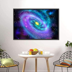 Experience the cosmic beauty of a spiral galaxy with this stunning canvas print. Swirling arms and a central yellow mass surrounded by glowing particles create a captivating scene that evokes awe and wonder. Ideal for modern decor, this artwork brings the mysteries of space into your home.