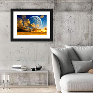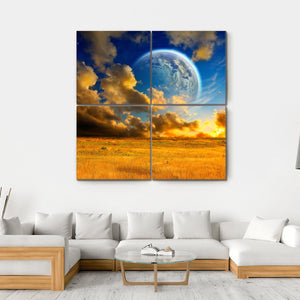 This canvas features a stunning landscape of a planet amidst a surreal sky, showcasing visible continents and clouds. The dramatic sunset lighting in shades of blue, gold, and orange creates an awe-inspiring ambiance that enhances any room.