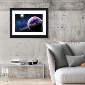 This captivating canvas art features a distant planet surrounded by a striking ring of asteroids, set against a glowing nebula and a bright moon. Its cosmic palette of purples, blues, and blacks evokes a vast and mysterious atmosphere, making it a perfect addition to any space-themed décor.