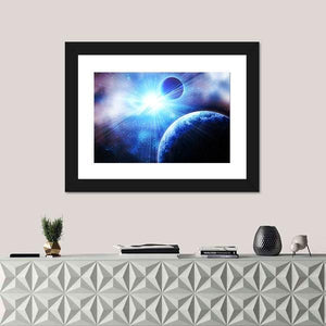Planets Against Sun Canvas Art shows planets and a bright sun set against a starry nebula in deep blues, purples, white, and black. The modern, abstract composition uses depth, framing, and radiating light beams around two celestial bodies to convey a cosmic, ethereal mood. It suits modern or contemporary rooms as wall decor.