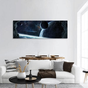 A panoramic space scene featuring a large ringed planet, a smaller moon and a streaking spaceship seen from a cave opening. Rendered in blue, black, white and grey tones, the cinematic sci‑fi image feels epic and mysterious. It suits modern room decor and sci‑fi themed spaces.