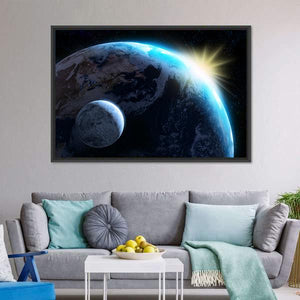 This panoramic canvas features a breathtaking view of the Earth from space, capturing the awe-inspiring moment of sunrise. The serene palette of blue, white, yellow, and black invites a sense of vastness, making it an engaging piece for any modern decor.