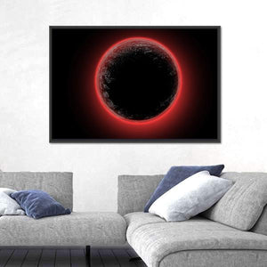 This captivating canvas art showcases a dramatic red planet set against a vast black space, enhanced by a glowing halo. The mysterious and ominous atmosphere invites contemplation, making it an intriguing addition to any wall decor.