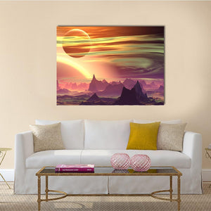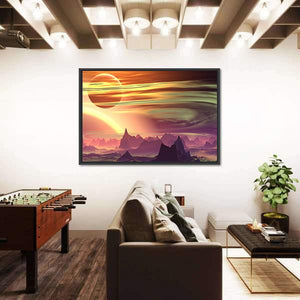 Explore a surreal alien landscape featuring jagged purple mountains and a luminous moon. This vibrant artwork captures the otherworldly atmosphere with swirling clouds in shades of orange, yellow, and green, making it a captivating focal point for any room.