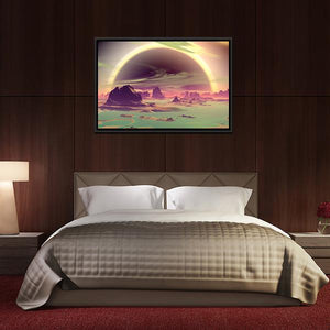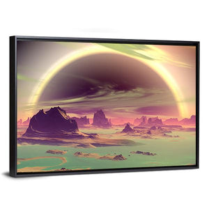 Experience a surreal landscape set on an alien planet. This canvas features jagged rock formations rising from a teal sea, under a glowing atmosphere dominated by a vibrant ring encircling a dark planet and colorful, streaky clouds. Perfect for those who appreciate sci-fi and astronomy art.