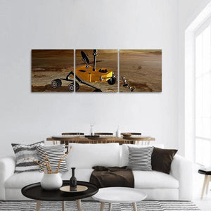 This panoramic print shows a yellow Mars rover crossing rocky, barren terrain beneath a hazy distant horizon, conveying an exploratory, desolate mood. The realistic sci-fi rendering and earthy brown, yellow, gray, and orange palette fits modern or science-themed rooms and home offices.