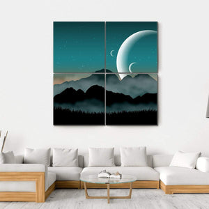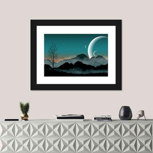 This canvas art features a tranquil, layered landscape with towering mountains and a silhouetted tree beneath a mesmerizing night sky. Two moons illuminate the scene, creating an ethereal atmosphere that invites contemplation.