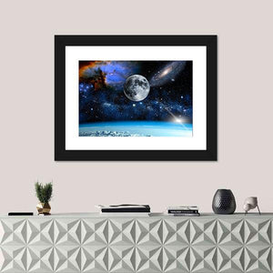 Experience the awe of Earth from space with this serene canvas wall art. Featuring a stunning photo-realistic depiction of the Moon, swirling clouds, and a bright sunburst, it captures the vastness of our universe.