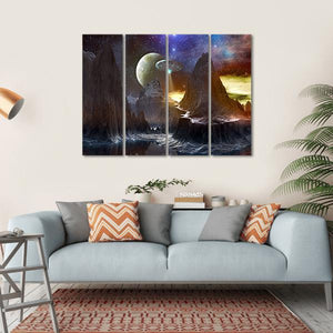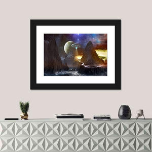 Explore a vibrant alien landscape featuring a UFO, mountains, and a large moon under a starry sky. This otherworldly canvas artwork captures a sense of mystery and awe, perfect for adding a unique touch to your decor.
