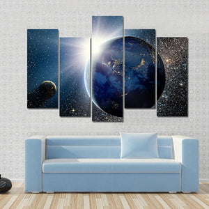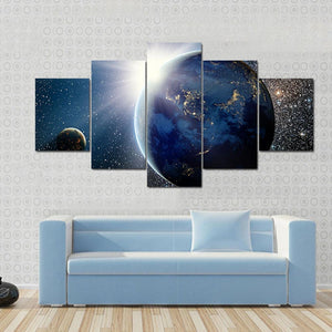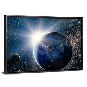 This canvas art beautifully depicts Earth against a starry backdrop, featuring the moon and a vibrant sunburst. The cosmic scene, illuminated by glowing city lights, creates a serene and awe-inspiring atmosphere.