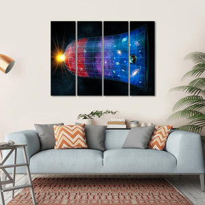 Explore the vastness of the cosmos with this captivating artwork depicting the expansion of the universe. It features galaxies at different stages against a cosmic backdrop of red, blue, and black, creating a scientific yet abstract charm for your space.