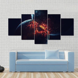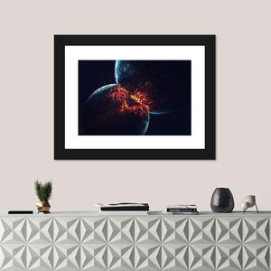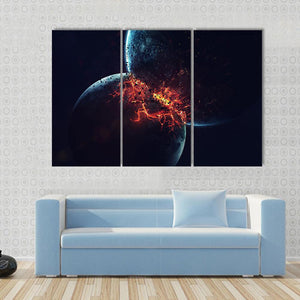 This canvas art vividly captures a chaotic cosmic collision of exploding planets. The dramatic scene, featuring molten orange materials and glowing cracks, evokes a powerful sense of depth in outer space.