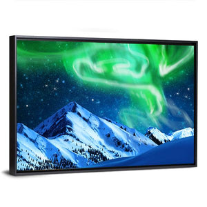 Experience the magical beauty of the aurora borealis illuminating snowy mountains beneath a starry night sky. The vibrant green and blue hues create a serene atmosphere, making this artwork a stunning addition to your room decor.