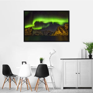 Experience the serene beauty of the aurora borealis over the stunning mountains and tranquil waters of Lofoten, Norway. This vertical canvas wall art captures a magical night sky filled with stars, evoking a sense of awe and connection with nature.