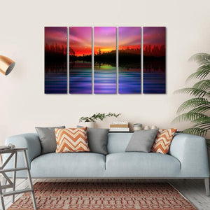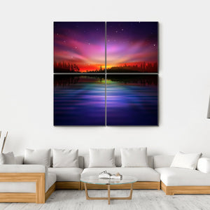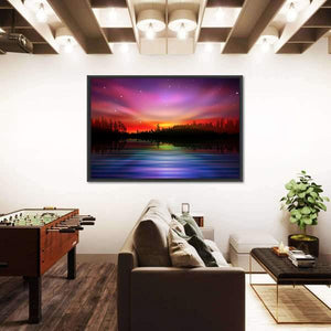 This landscape art features a dreamy pink aurora borealis, set against a serene night sky filled with stars. Silhouetted trees and a rippling lake reflect the beautiful colors of purple, orange, and blue, creating a mystical atmosphere perfect for any modern decor.