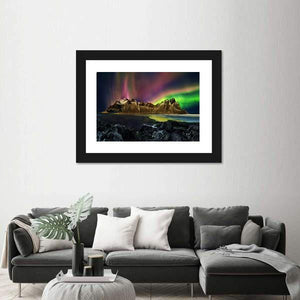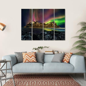 Experience the magic of Iceland with this canvas print showcasing the Vestrahorn Mountain Range beneath a stunning aurora borealis. The serene palette of greens, pinks, and purples will compliment various decor styles, evoking a sense of awe and tranquility.