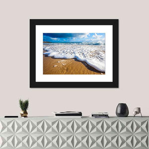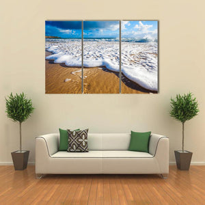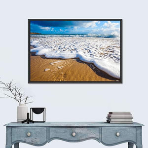 This canvas art captures the beauty of a serene Australian beach, featuring foamy ocean waves rolling over golden sand. The dynamic scene showcases a low-angle perspective, inviting a sense of calm to your space.