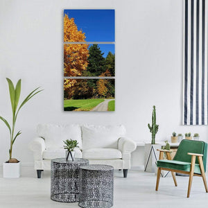 A realistic autumn landscape with a lone tree, winding path, and rich fall foliage that feels both vibrant and peaceful. Warm yellows and oranges mingle with greens and soft blues to create depth and calm. Suited to living room or hallway wall decor and modern or nature-inspired interiors.