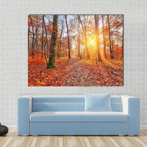 This artwork captures a serene autumn forest scene, with sunlight filtering through the trees and a carpet of fallen leaves. Its warm palette of orange, brown, green, and yellow brings a peaceful vibe to any space.