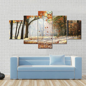 This canvas art captures the serene beauty of autumn with vibrant falling oak leaves amidst a tranquil forest. The sunlight filters through the trees, creating a peaceful atmosphere that enhances any space.