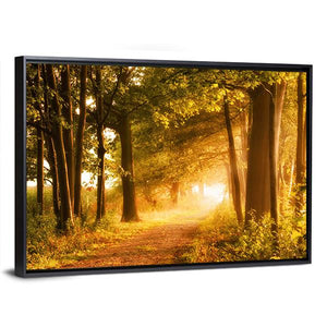 A misty footpath winds through a sunlit forest of green, yellow, brown, and orange leaves. Sunbeams filter through the trees and dapple the path, creating a peaceful, inviting atmosphere. This tranquil scene pairs well with home decor, especially modern or nature-focused rooms.