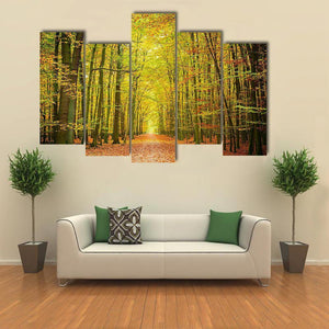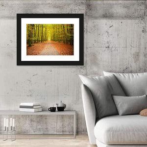 This canvas wall art features a serene forest path adorned with vibrant autumn leaves. The peaceful scene, with its rich palette of green, yellow, orange, and brown, invites you to escape into nature's beauty.