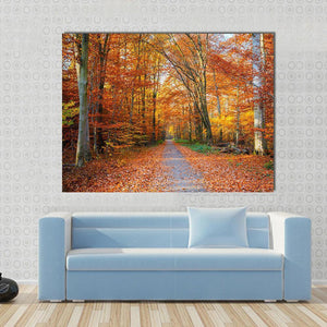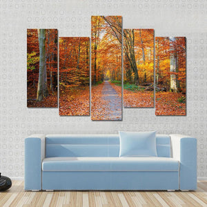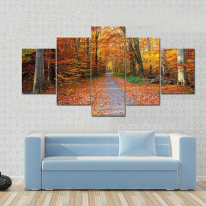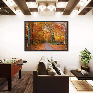 This canvas art captures a serene forest path lined with colorful autumn leaves. With sunlight filtering through trees, it creates a peaceful and vibrant atmosphere that brings nature indoors.