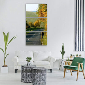 A solitary man walks along an autumn roadside lined with yellow and orange trees and rolling hills, the white dashed lines drawing the eye down the road. The realistic landscape uses leading lines and depth to create a peaceful, contemplative mood. Suits modern or nature-inspired wall decor.
