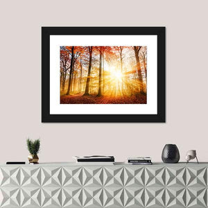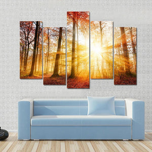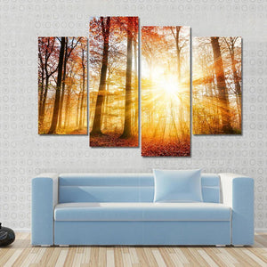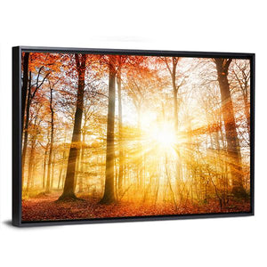 This canvas wall art captures a serene autumn forest where warm sunlight pierces through the trees. The vibrant palette of orange, gold, and red reflects nature's beauty, making it a soothing addition to your space.