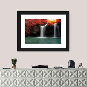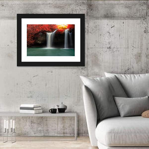 This captivating canvas art features twin waterfalls surrounded by majestic red trees, creating a serene atmosphere. The vibrant colors and depth of the scene evoke the beauty of autumn, making it a lovely addition to your nature-inspired décor.