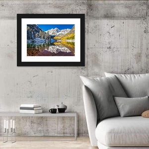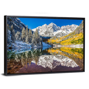 This serene landscape features majestic mountains and a tranquil lake, surrounded by a forest and reflected in calm waters. The artwork captures the peaceful beauty of winter foliage and a clear blue sky, making it an inviting addition to any nature lover's décor.