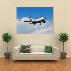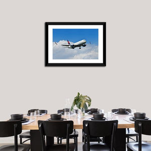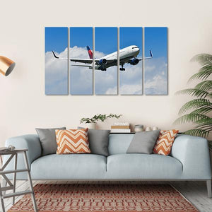 This striking canvas art captures a Delta airplane approaching the runway, surrounded by a dynamic sky filled with clouds. The blue and white palette evokes a sense of travel and soaring heights, making it a perfect addition to any modern room decor.