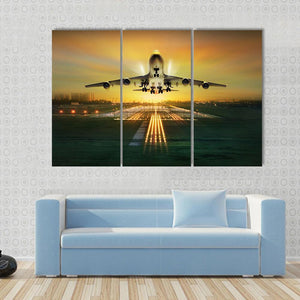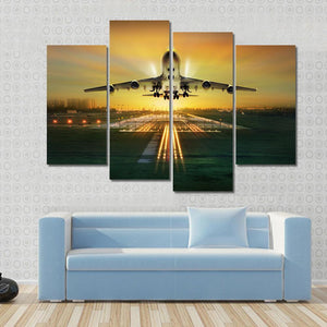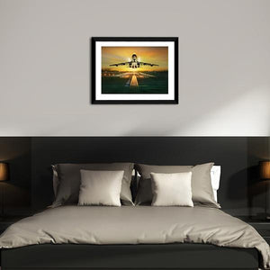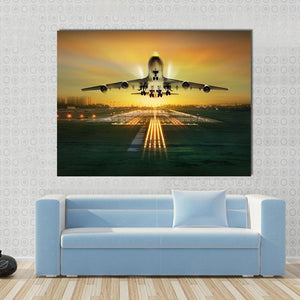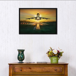 This photorealistic canvas captures the exhilarating moment of an airplane taking off from a runway, set against a dramatic sunset. With its vibrant palette of orange, yellow, and green, it evokes feelings of adventure and hope, making it a captivating piece for any space.