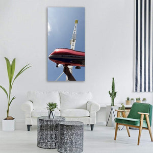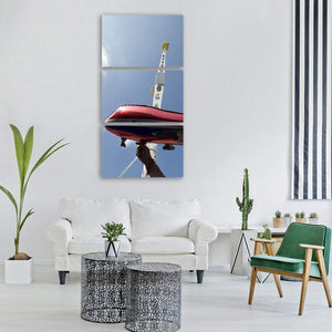 A photorealistic canvas showing an inflatable airplane from a low, upward view—centered and playful in mood. The bright red, blue, white, and yellow palette brings a whimsical, fun feeling that works well as room decor for kids’ rooms or casual, playful spaces.