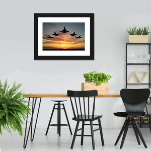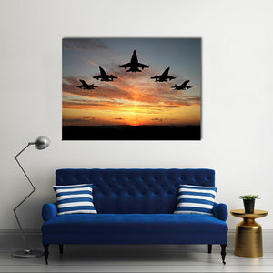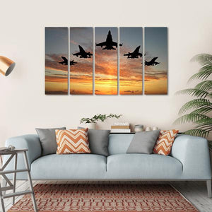 Experience the power and drama of fighter jets soaring against a stunning sunset. This modern canvas art captures five jets in a V formation, surrounded by clouds illuminated in vibrant hues of orange and blue, creating a serene yet striking silhouette.