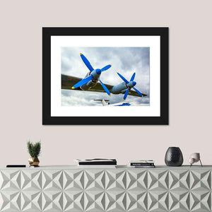 This canvas shows a close-up view of a twin-engine aircraft wing and propeller blades against a cloudy daytime sky. The dutch-angle composition and blue-gray palette create a dynamic, powerful aviation mood. It suits modern home or office walls that welcome bold aviation imagery.