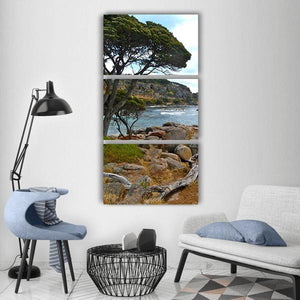 A realistic coastal scene featuring driftwood, gnarled tree branches, boulders on the shore, and choppy ocean water in a green, blue, brown and gray palette. The image has a peaceful, natural mood and uses a rule-of-thirds composition to guide the eye. It suits modern coastal or nature-inspired rooms and simple wall decor schemes.