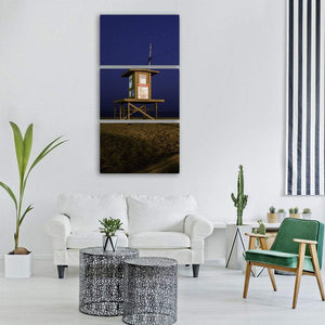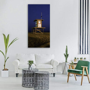 A lifeguard tower stands centered on a quiet sand beach beneath a star-filled night sky, captured in a realistic photographic style. The blue, brown and soft yellow palette creates a serene, tranquil atmosphere. Fits coastal, modern, or nature-inspired rooms as a calm focal piece.
