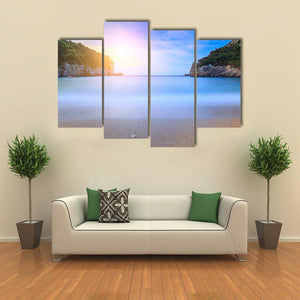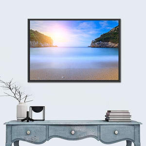 A close-up scene of a sand beach in a sheltered bay, with cliffs and a soft sunset sky. Long-exposure water blurs the turquoise sea into gentle bands of blue and green while two shells rest on the tan sand, creating a peaceful, tranquil mood. Pairs well with modern or coastal room decor.