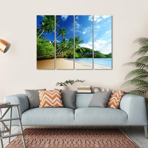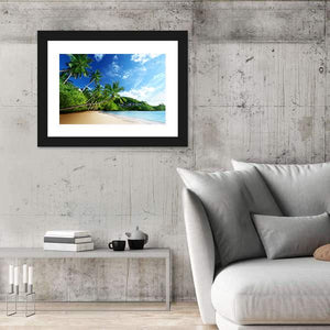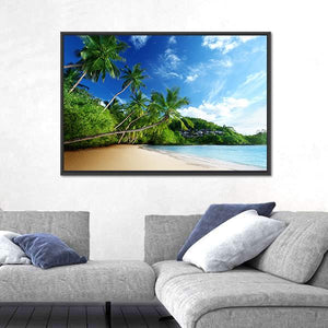 Experience the serene beauty of a tropical beach with our Sunset On Beach Anse Takamaka canvas wall art. Featuring gentle waves and palm trees under a clear blue sky, this piece brings a bright and peaceful atmosphere to any space.