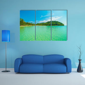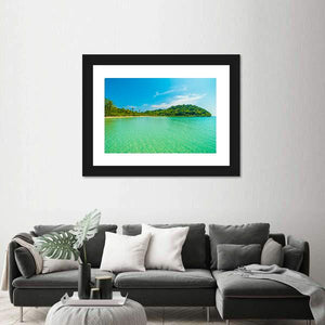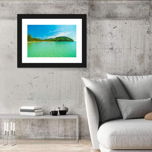 A wide-angle, realistic view of a tropical beach and sea featuring clear turquoise water, a sandy shore, palm trees and distant islands. The scene feels serene and idyllic, with blue, green, white and yellow tones that work well in modern or coastal room decor.