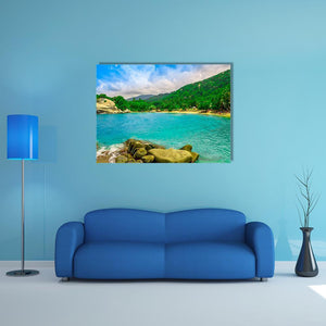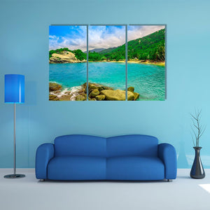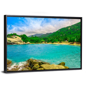 View of Cabo San Juan depicts a tropical beach lined with palm trees, rocks in the foreground, boats on the water and distant mountains. Realistic turquoise, green, white and brown tones and a rule-of-thirds composition create a serene, vibrant tropical mood that suits modern home and room decor.