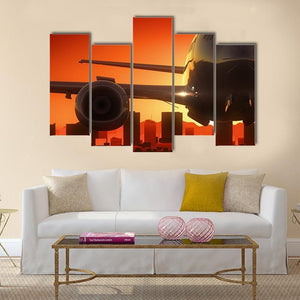 An airplane wing and engine slice through a sunrise sky above a silhouetted city skyline, shown in close-up with cockpit window and jet engine detail. The photorealistic image feels dramatic and powerful, suited to modern living rooms or travel-themed rooms.