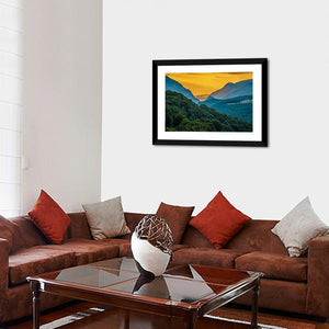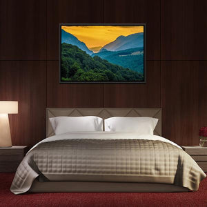 Montenegro Mountains Canvas Wall Art depicts layered mountain ranges above a dense green forest beneath a vibrant yellow-orange sky, rendered in a realistic landscape style. The scene feels serene and majestic, and its natural palette suits modern or nature-focused living rooms and bedrooms.